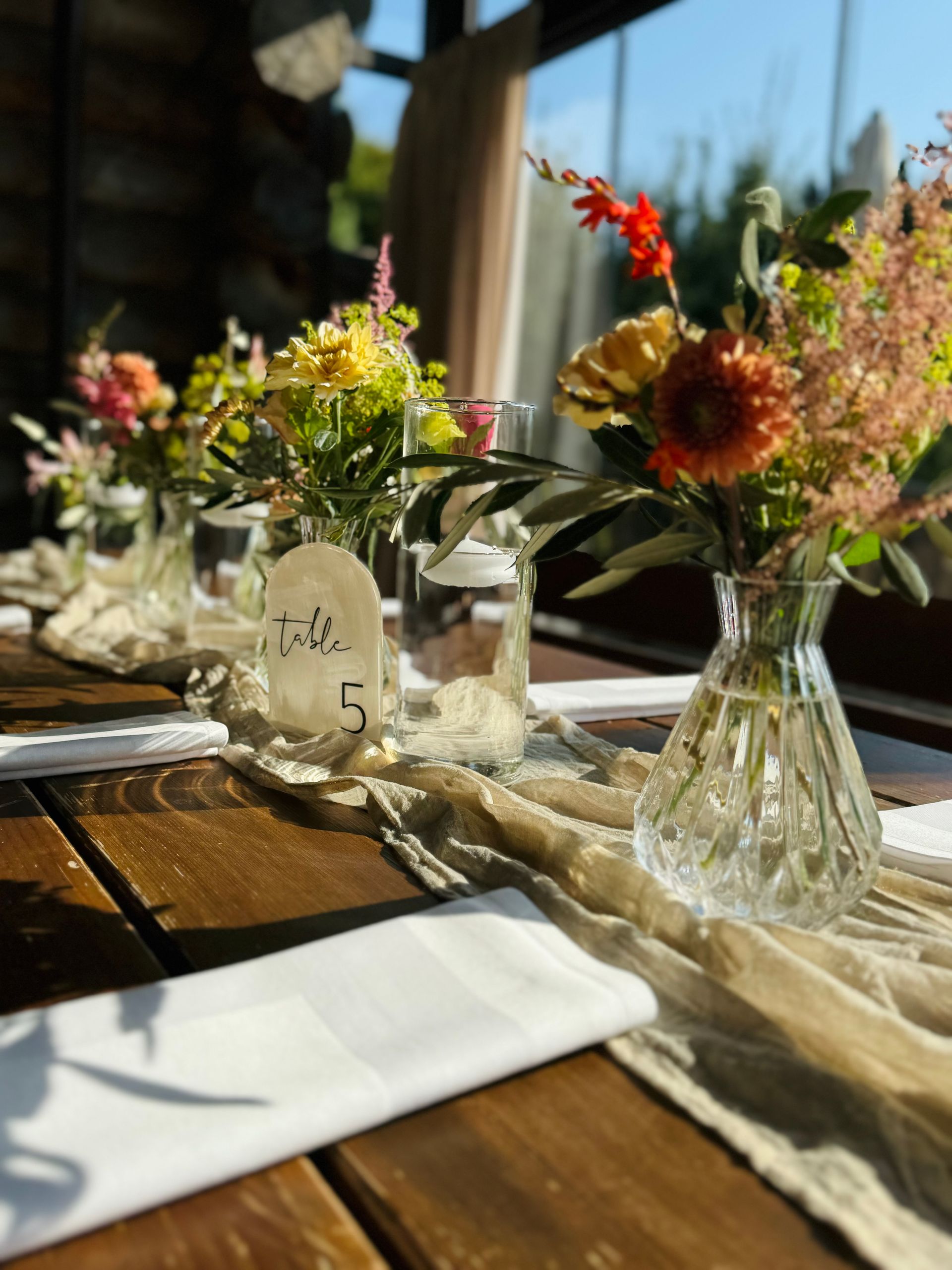 Die Tischdekoration ist das Herzstück jeder Hochzeitsfeier und spiegelt die Magie Ihres besonderen Tages wider. Mit einer liebevollen Kombination aus prächtigen Blumen, stilvollen Details und sanften Farben gestalten wir eine Atmosphäre, die Ihre Liebe zum Strahlen bringt.